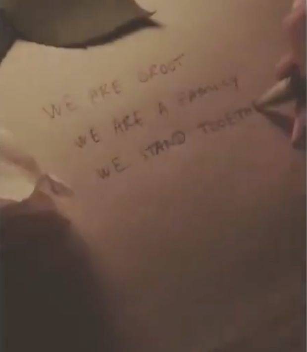“螳螂女”龐·克萊門捷夫發佈一段短視頻,她用筆在紙上寫道:我們是格魯特,我們是一個家庭,我們團結一致。