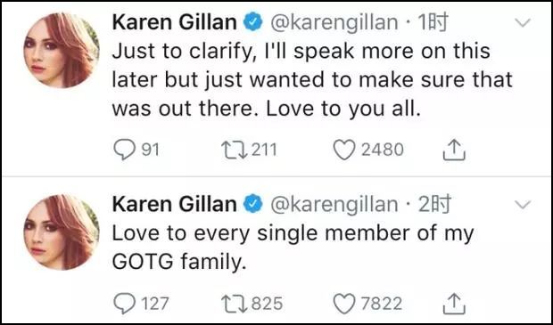“星雲”吉蘭表示:“愛《銀河護衞隊》家族的每一個成員。”並隨後表示:“只是想澄清一下,我稍後會就此詳細説明,但只是想聲明一下。愛你們所有人。”