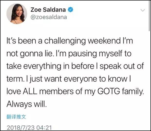 卡魔拉表示:“這是一個充滿挑戰的週末,我不會撒謊。在我發聲之前,我會暫停下來消化一下目前的事情。我只想讓每個人都知道我愛《銀河護衞隊》家族的所有成員,一直都是。”