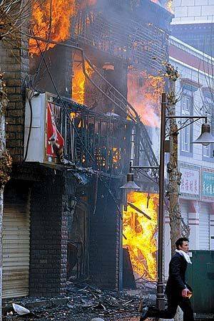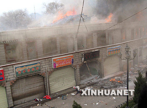 拉薩朵森格路上的商店正在燃燒。新華社記者格桑達瓦攝