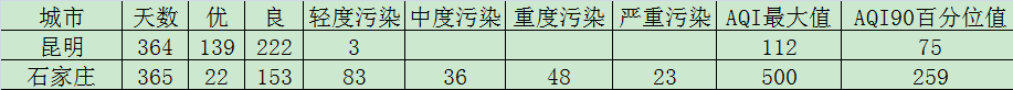 2016年昆明、石家莊空氣質量統計對比表