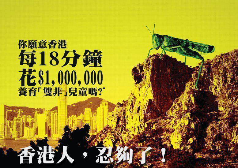 2012年2月1日,某香港網站論壇用户在黎智英旗下的《蘋果日報》刊登了一整版廣告,一隻碩大的綠色蝗蟲爬上香港獅子山,俯視着維多利亞港灣,並配以這樣的文字:“你願意香港每18分鐘花100萬元養育‘雙非’兒童[14]嗎?”,“因為明白你們受毒奶粉所害,所以容忍你們來搶購奶粉;因為明白你們沒有自由,所以招待你們來港‘自由行’;因為明白你們教育落後,所以分享了教育資源給你們;因為了解你們看不懂正體字[15],所以下面用了殘體字[16]:‘來香港請尊重本地文化,要不是香港你們全完蛋了’”。而廣告的主標題是:“香港人,忍夠了!”