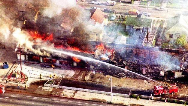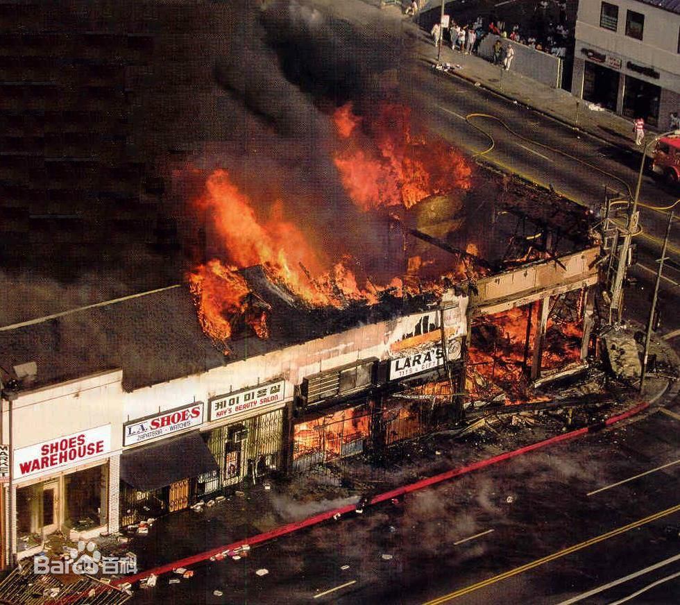 僅僅兩小時後,熊熊大火在洛杉磯四處燃起,黑煙瀰漫、槍聲四起,很多黑人趁火打劫,湧進商店哄搶,洛杉磯的法律和秩序徹底癱瘓,四分之一的城區陷入火海之中。更為嚴重的是,暴亂出現蔓延趨勢,美國各大城市都出現動亂跡象。美國總統老布什不得不調動大量的聯邦軍隊和加州國民警衞隊進入洛杉磯平暴。