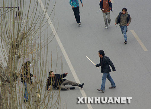 不法分子手持棍棒、匕首準備圍攻一名摔倒的男子。新華社發