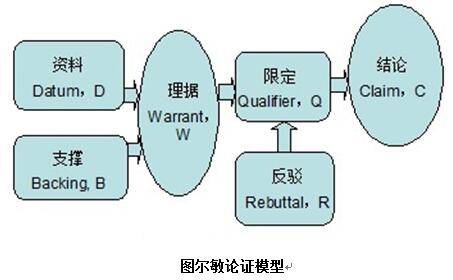 在圖爾敏提出的論證模型中,論證不再是簡單地收集證據或事實,而是一個持續的、層層深化的過程。在圖爾敏的論證模型中包含資料(datum,D)、支撐(backing,B)、理據(warrant,W)、限定(qualifer,Q)、反駁(rebuttal,R)和主張(claim,C)等6個基本要素。論證的基本過程是:資料(D)和支撐(B)共同構成了理據(W),在接受了反駁(R)之後,經過限定(Q),使主張(C)得以成立。