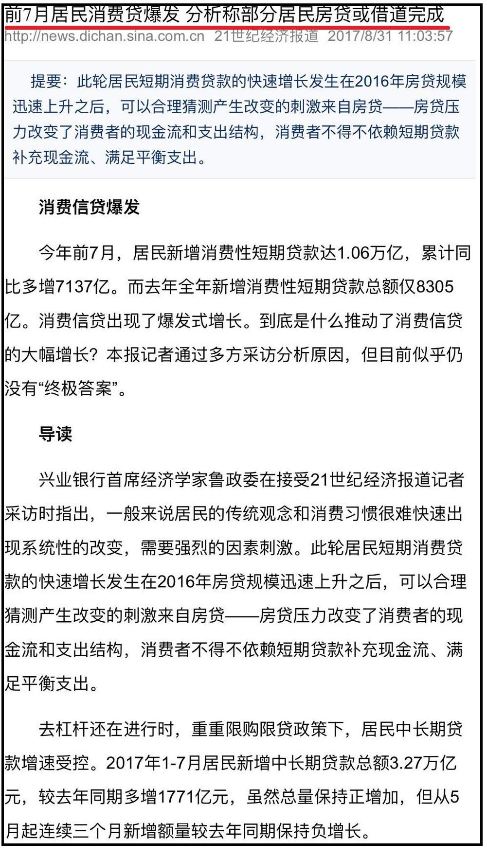 沒錯,短期貸款也在增加。僅17年的頭7個月,居民短期消費性貸款就增加了1.06萬億。並且,由於互聯網金融業的火熱,有許多的互聯網借貸產品的數據並沒有納入銀行的資產負債表上。例如,螞蟻家的”借唄“上線一週年就發了494億的消費貸款。