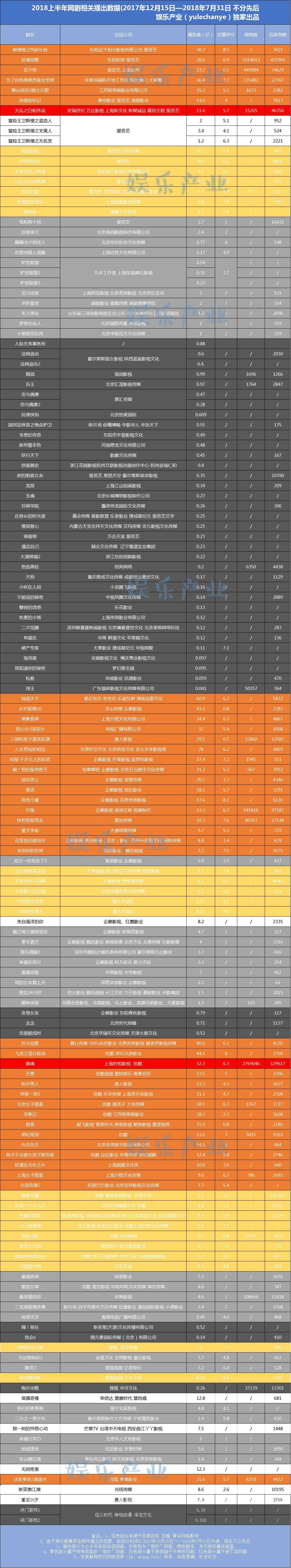 1、以播放量、豆瓣評分為主,微指數、百度指數為輔;數據統計時間為2017年12月15日—2018年7月31日。