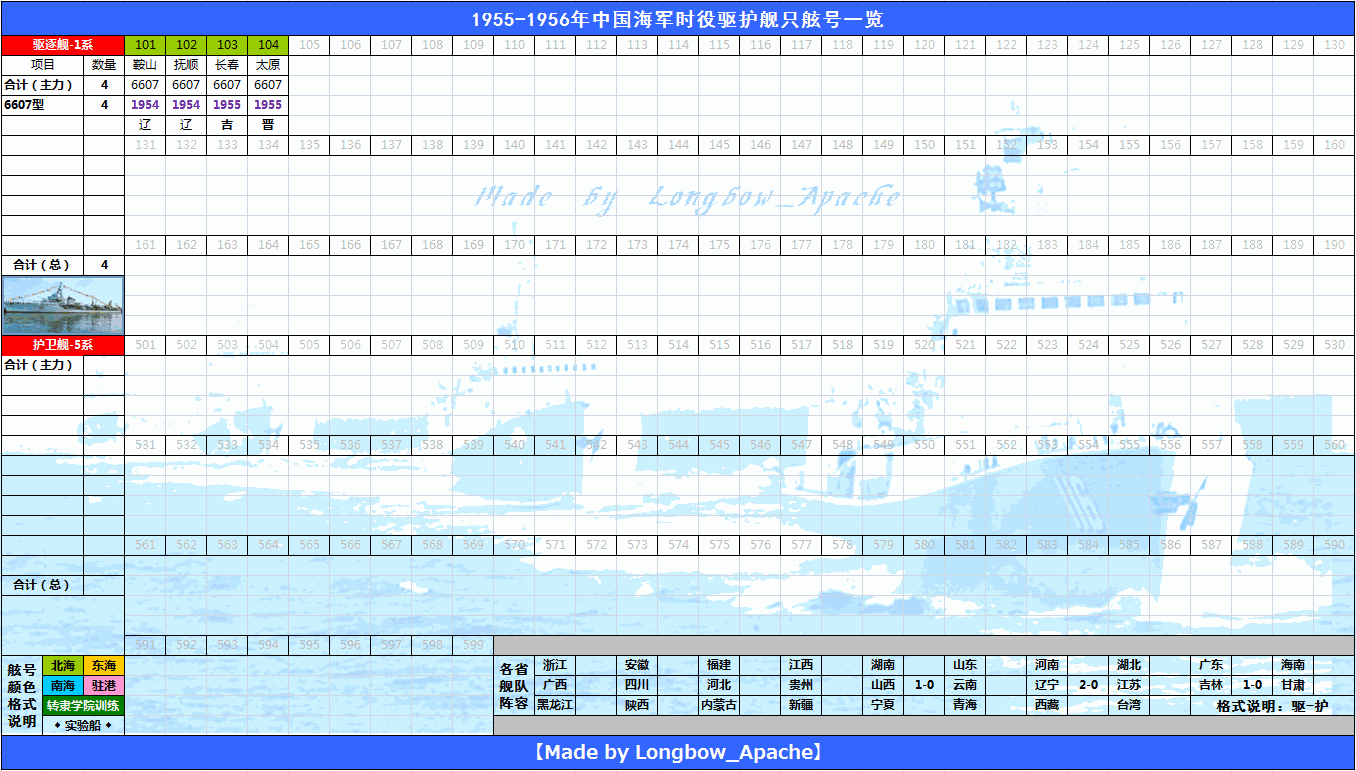 ★ 1954年初,人民海軍接收4艘向蘇聯訂購的6607型驅逐艦,並命名為鞍山艦、撫順艦、長春艦和太原艦(當時四艘艦的舷號為201-204,1974年舷號統一後,更改為101-104)。自此,我海軍開始走上裝備正規化道路。