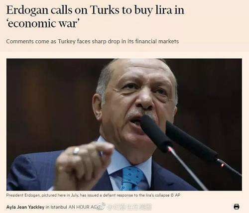 土耳其貨幣里拉近日持續貶值,週五土耳其里拉兑美元匯率跌幅擴大至13.5%,最低至6.57,與去年相比,土耳其里拉匯率在一年中已經下跌超過66%,創歷史新低。面對危局,土耳其總統埃爾多安表示,土耳其當前正在面臨“經濟戰”,並且表示將對美國“實施報復”。