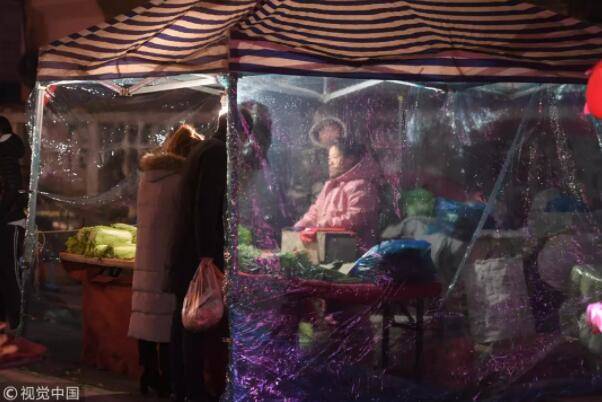 2017年11月17日,冷空氣席捲東北,瀋陽最低氣温達到了零下13℃,菜市場內,一些菜販給攤點扣上塑料大棚防寒,還在棚內燃起碳火加温,以免蔬菜受凍 / 視覺中國