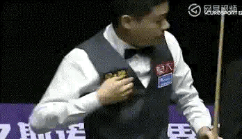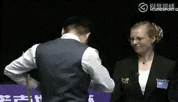 在交流過程中裁判面帶微笑並點頭,之後丁俊暉轉過身時,右胸只剩國旗,廣告都貼在了左胸: