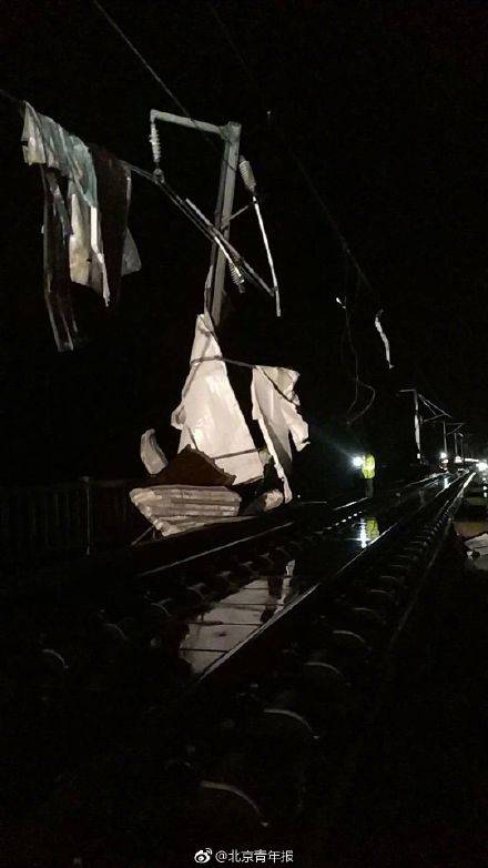 據北京青年報13日報道,北京鐵路部門披露了彩鋼板撞擊京滬高鐵線的圖片畫面。