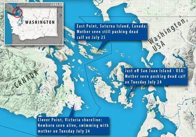 當時剛生寶寶的Tahlequah正和族羣裏其他虎鯨一起遊往其他水域,