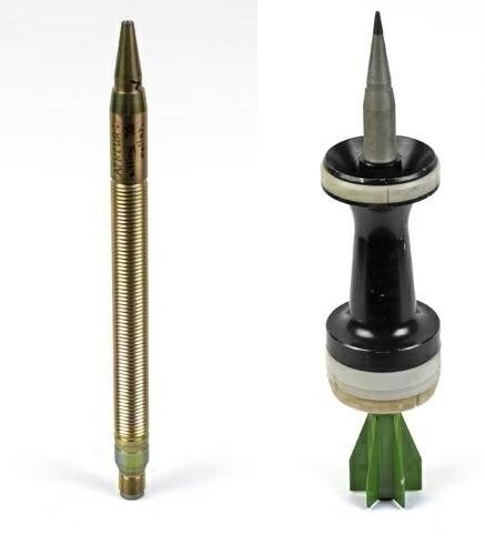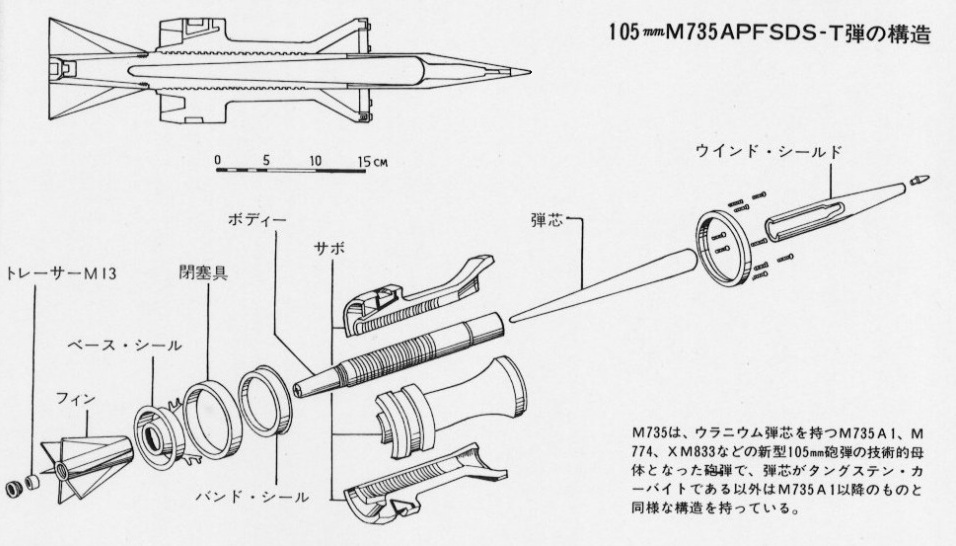 美國早期的M735穿甲彈,可見其頭部有一個很大的風帽和輕金屬整流罩,實際上彈杆是個水滴型,這其實比更早的APDS進步幅度有限