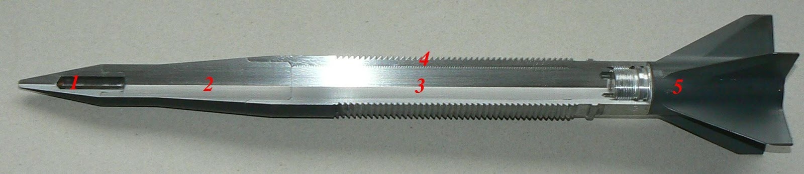 英國120毫米線膛炮的穿甲彈,看起來是個整體式彈芯,但實際上頭部尖鋭部位下方有個碎裂槽,炮彈撞擊目標時,頭部的尖錐會容易碎裂,這樣後面的彈杆就容易繼續穿透了,實際上這和風帽設計一樣,浪費了一截彈杆長度