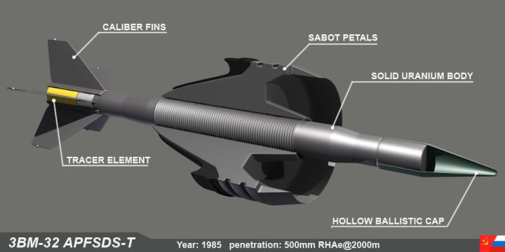 俄羅斯3BM-32穿甲彈,採用鈍頭彈芯,前面有個風帽