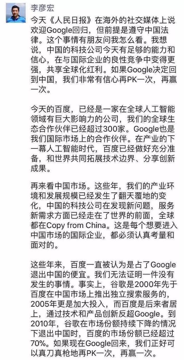 (李彥宏針對谷歌迴歸發表看法)
