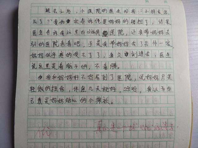 我和媽媽好不容易到了醫院,説媽媽只是輕微的扭傷,休息幾天就好了,哈哈,我認為自己真的是媽媽貼心的小棉襖!