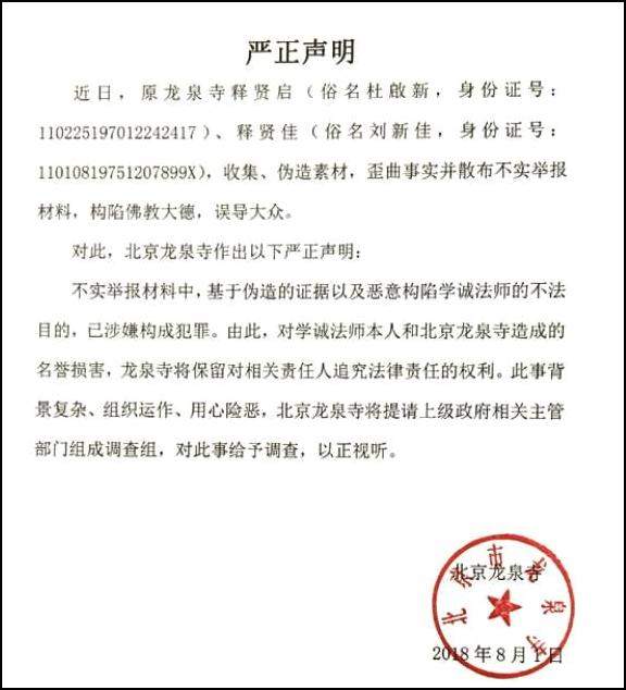 不是舉報材料中,基於偽造的證據以及惡意構陷學誠法師的不法目的,已涉嫌構成犯罪。由此,對學誠法師本人和北京龍泉寺造成的名譽損害,龍泉寺將保留對相關責任人追究法律責任的權利。此事背景複雜、組織運作、用心險惡,北京龍泉寺將提請上級政府相關主管部門組成調查組,對此事給予調查,以正視聽。