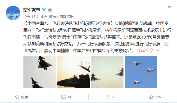 這是繼2013年8月赴俄羅斯參加莫斯科國際航展之後,八一飛行表演隊第二次赴俄羅斯進行飛行表演,在世界舞台上展現中國精神、中國力量和中國空軍的形象風采。
