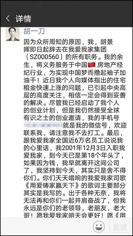 繼8月17日發表部分長租公寓推高房租的言論之後,今日9時,我愛我家副總裁、我愛我家集團研究院院長鬍景暉在朋友圈發佈辭職信,宣佈辭職。
