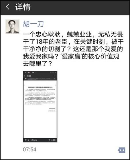 就在發佈辭職信之前,胡景暉發朋友圈稱:一個忠心耿耿,兢兢業業,無私無畏幹了18年的老臣,在關鍵時刻,被幹乾淨淨的切割了?這還是那個我愛的我愛我家嗎?“愛家贏”的核心價值觀去哪裏了?