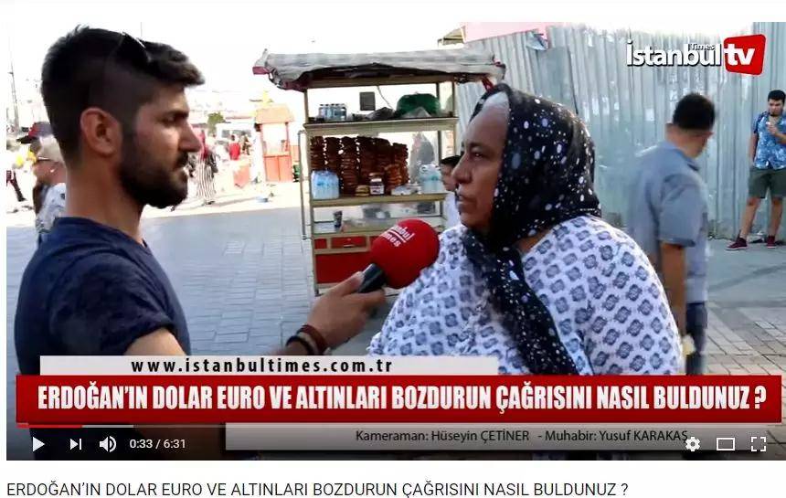 YouTube上獨立媒體對市民的採訪,詢問他們關於埃爾多安動員民眾將手中的美元換成里拉的看法。其中一位市民的回答是:“上次他做同樣的動員的時候,我就把我的美金換了。這一次我手中沒有美金了。”