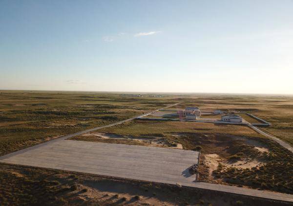 當記者來到位於新左旗阿木古郎鎮的現場時卻看到,原本治理完成的草場上,建起了一座殯儀館,殯儀館旁邊還有空蕩蕩的停車場,灰色的水泥地面與盛夏的草原格格不入。停車場一輛車也沒有,從高處看,殯儀館和停車場就像草原上的“斑禿”。