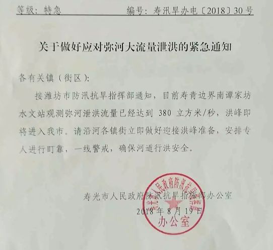 筆者在19日晚的《壽光新聞》節目的跑馬字幕中還看到一條通知,大致內容是:中共壽光市委辦公室、壽光市人民政府辦公室聯合下發關於做好防雨防災的緊急通知,氣象部門已經於19日12時53分將暴雨藍色預警升級為暴雨橙色預警;同時因上游水庫泄洪,冶源水庫泄洪量400立方米/米,黑虎山水庫200立方米/秒 嵩山水庫20立方米/秒,加上區間來水,整個彌河泄洪量預計超過800立方米/秒。