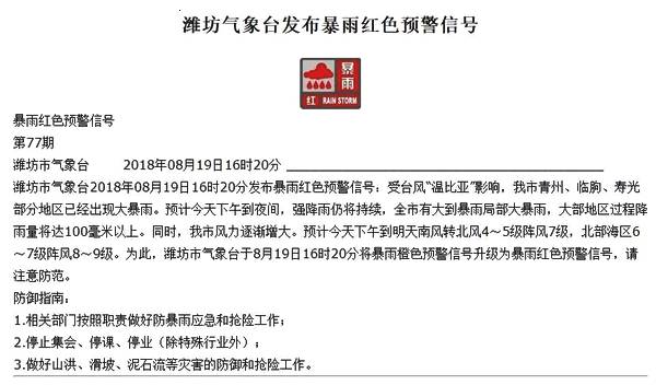 也就説到19日中午,彌河的水量就非常之巨大了,而此時降雨最為集中的時段才剛過去一半。濰坊市氣象台於8月19日16時20分,將暴雨橙色預警信號升級為暴雨紅色預警信號;於8月20日6時48分解除暴雨紅色預警信號。