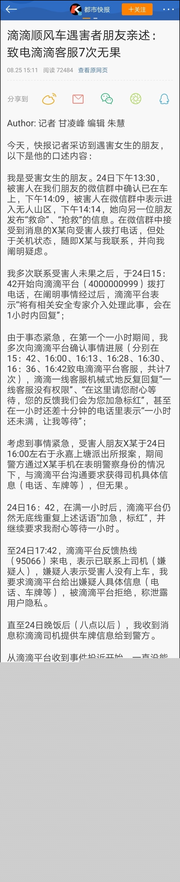 我相信任何一個腦子正常的人,在前有鄭州空姐案下,在後有受害者朋友一而再再而三的危急情況告知下,都應該知道這時候無論如何都不應當再聯繫司機,你就是個豬腦子也應該知道這時候聯繫司機意味着什麼吧?在鄭州空姐遇害案後,滴滴作為平台方至今居然還沒有建立靠譜的機制,依然是全程坐等警方來求你給信息,你平台前後七次接到羣眾反映的危急情況都不知道稍微負點責任來主動問問當地公安機關有沒有接到報警?這很難嗎?不主動聯繫警察,居然跑去聯繫嫌疑最大的司機???然後告訴報警人説司機説的受害人沒有上車???就完了???警察不問你就不理,那行吧,尊重隱私。警察問了你都不理?exome?案發前一天接到的騷擾舉報都不理也就不難理解了吧。