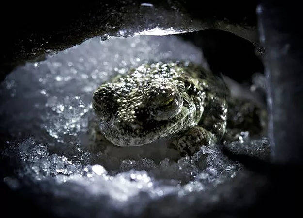 整隻結冰的活體冷凍青蛙彷彿一個堅硬的易碎冰雕。
