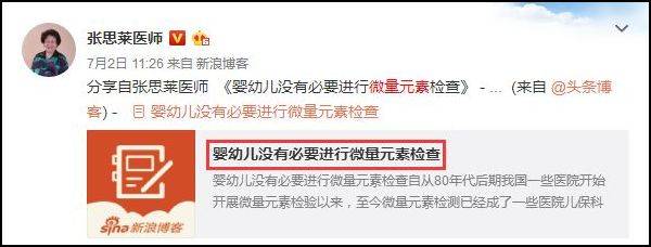而且現在很多醫生都會告訴家長,“寶寶缺乏微量元素會影響身體發育,檢查完孩子應該缺啥補啥”。但是,許多育兒專家,包括知名兒科專家崔玉濤、兒科醫生張思萊、演員馬伊琍都認為微量元素檢查沒有必要,甚至反而會害了孩子!