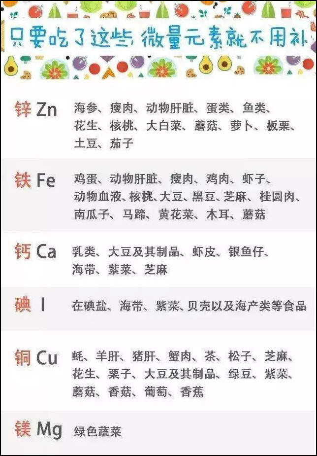 最後,拒絕做微量元素檢查,讓孩子少扎針,給自己和家人都省心省力。如果擔心孩子飲食不均衡,倒不如按照下圖通過食物補充。