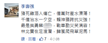 對此,台灣資深媒體人鄭師誠怒酸説,洪水都退一大半了,蔡女士才想起來心中“最軟的一塊兒”?坐着裝甲車出來視察,是要擺駕大馬路讓災民景仰嗎?