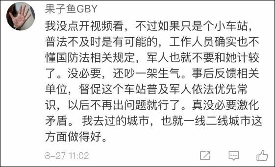 視頻裏,車站工作人員一直強調,“我們這邊沒有貼軍人優先的標識,沒有設立軍人優先的窗口,麻煩您排隊。”