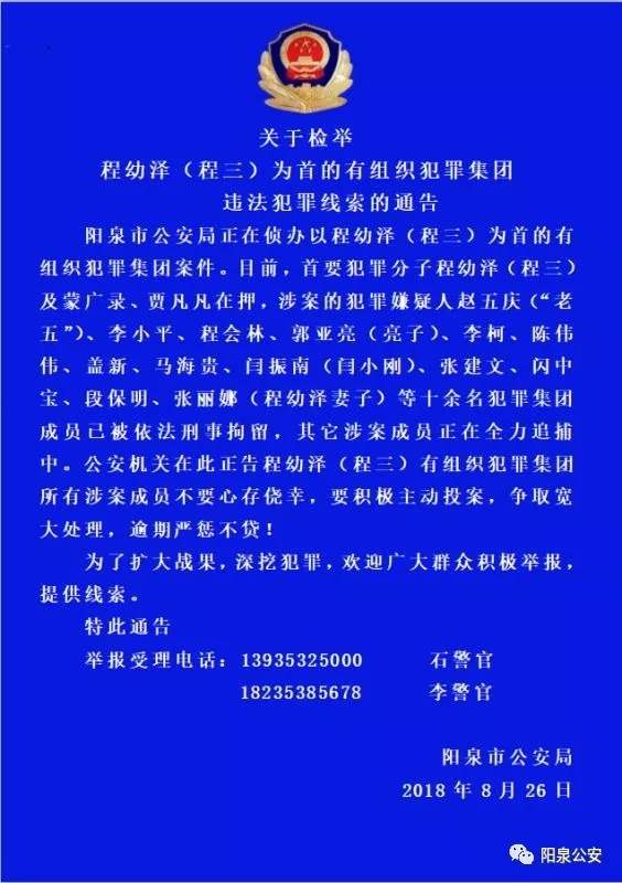 8月26日,山西陽泉市公安局認證微信公眾號“陽泉公安”發佈《關於檢舉程幼澤(程三)為首的有組織犯罪集團違法犯罪線索的通告》(以下簡稱“《通告》”)稱,陽泉市公安局正在偵辦以程幼澤(程三)為首的有組織犯罪集團案件。