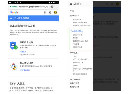 隱私設置檢查展示了Google會提供給用户哪些服務,並且用户選擇是否將個人數據授權給服務進行個性化展示。個性化數據主要有網絡活動記錄、位置記錄、設備信息、搜索記錄、YouTube觀看記錄等,此外提供了個人信息分享開關和廣告功能開關,如下圖。