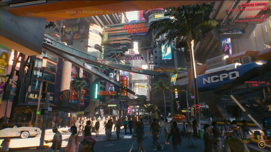 製作組努力讓夜之城看起來是所有開放式遊戲中最真實的城市,NPC都有着自己的生活。下圖右方我們還可以看到夜之城警察局(NCPD)