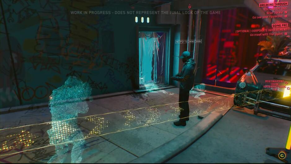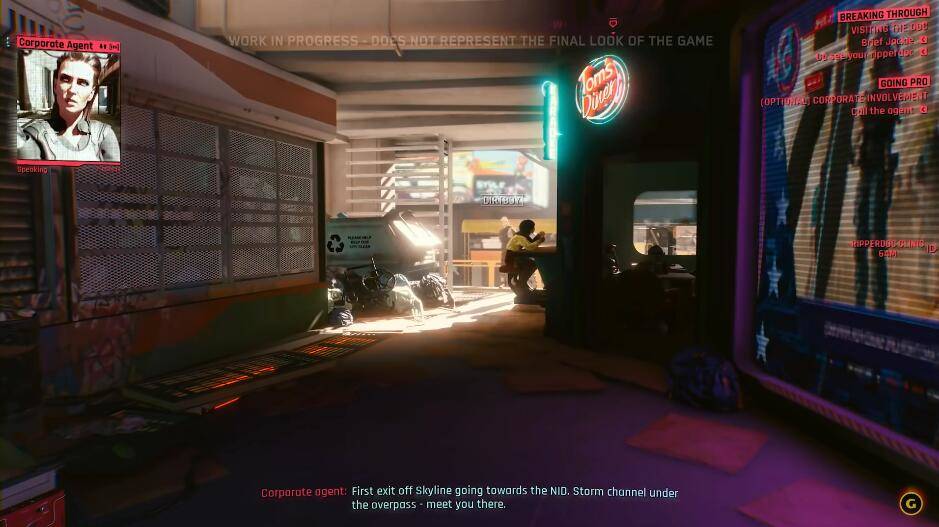 大佬就是大佬,給我們任務之前要確認玩家的能力,所以要先做一個實驗任務。這個實驗任務就是從一個當地黑幫手上追回一件“Militech公司”被盜的武器設備。演示人員表示,任何任務都有多種完成的方式,在演示中他們決定先給公司代表打個電話。約個地方見面。