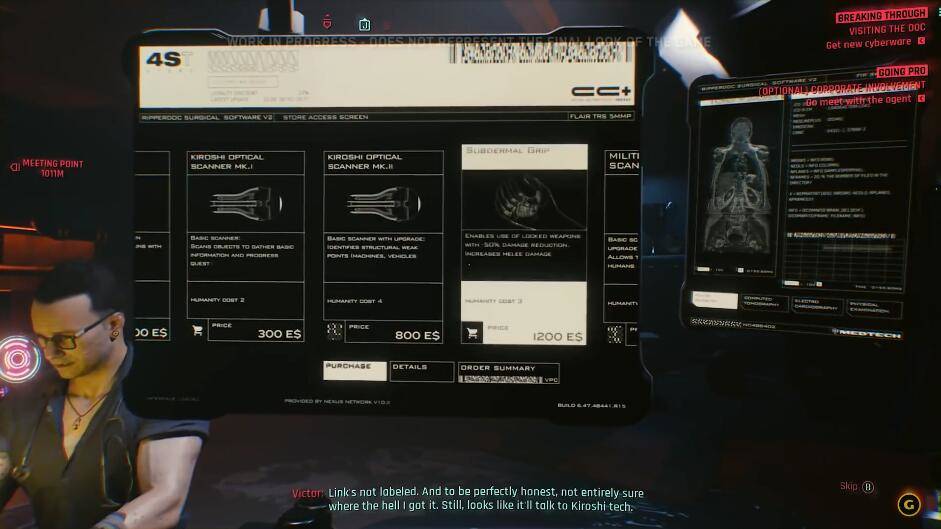 見到了義體醫生Victor,選擇了眼部和手部的手術,增強了能力。遊戲中有兩種義體醫生,合法的和非法的。黑市中的義體醫生,只要你出的價錢合適,他們可以為你做任何改裝。