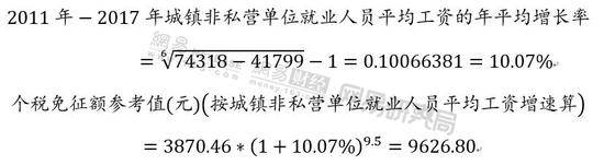 如果我們考慮另外一個維度——勞動者的工資增長率,根據國家統計局的數據,2017年,城鎮非私營單位就業人員平均工資為74318元[v],比7年前上次調整個税起徵點時增加了32519元,這7年來城鎮非私營單位就業人員平均工資的年平均增長率達到了10.07%,從更接近民生的角度來説,假設下次上調個税起徵點是在9.5年後且接下來的9.5年城鎮非私營單位就業人員平均工資的年平均增長率仍以不低於10.07%的速度增長,則個税起徵點需至少達到9626.80元,才能追平居民的工資平均增速。