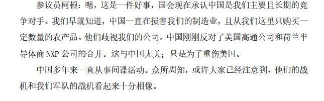 事實上,會上,特朗普本人雖未將法案直指中國,但湯姆卡頓、盧比奧等國會議員均赤裸裸將矛頭直指中國,稱“該法案為解決中國所構成的國家安全威脅邁出了重要的一步”。幾段發言很有意味: