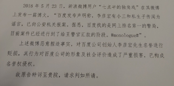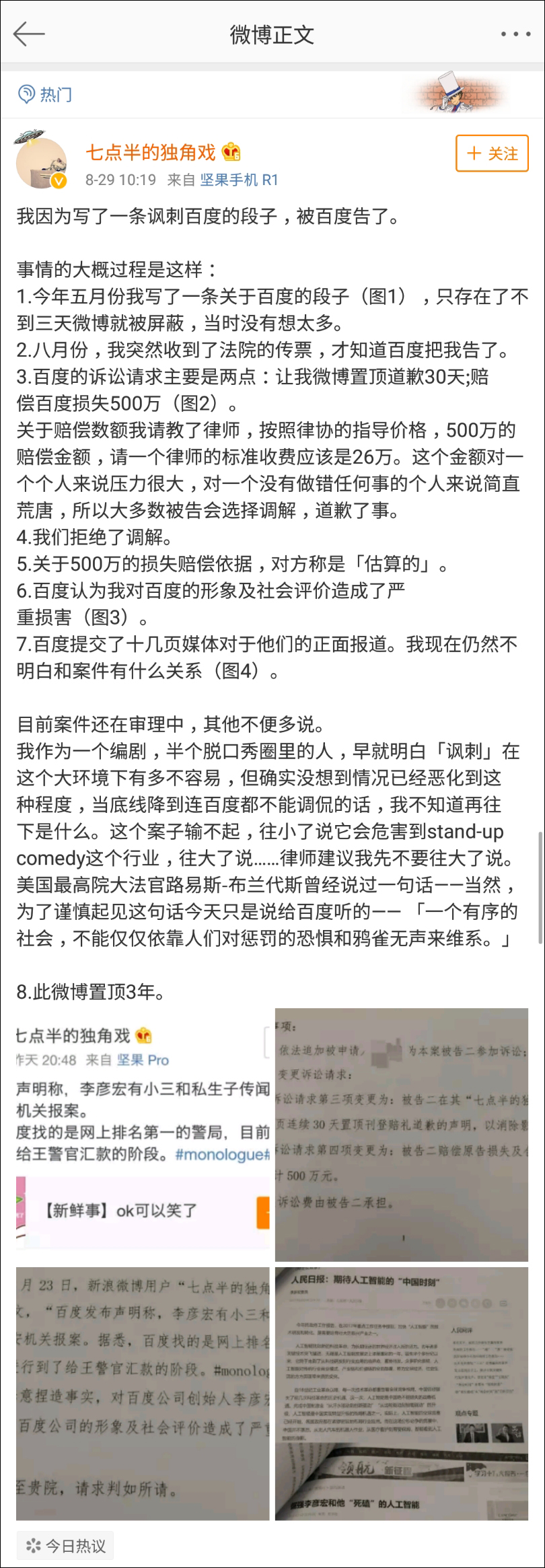 今天微博網友@七點半的獨角戲 發博表示,自己因為寫了一條諷刺百度的段子,被百度告了。