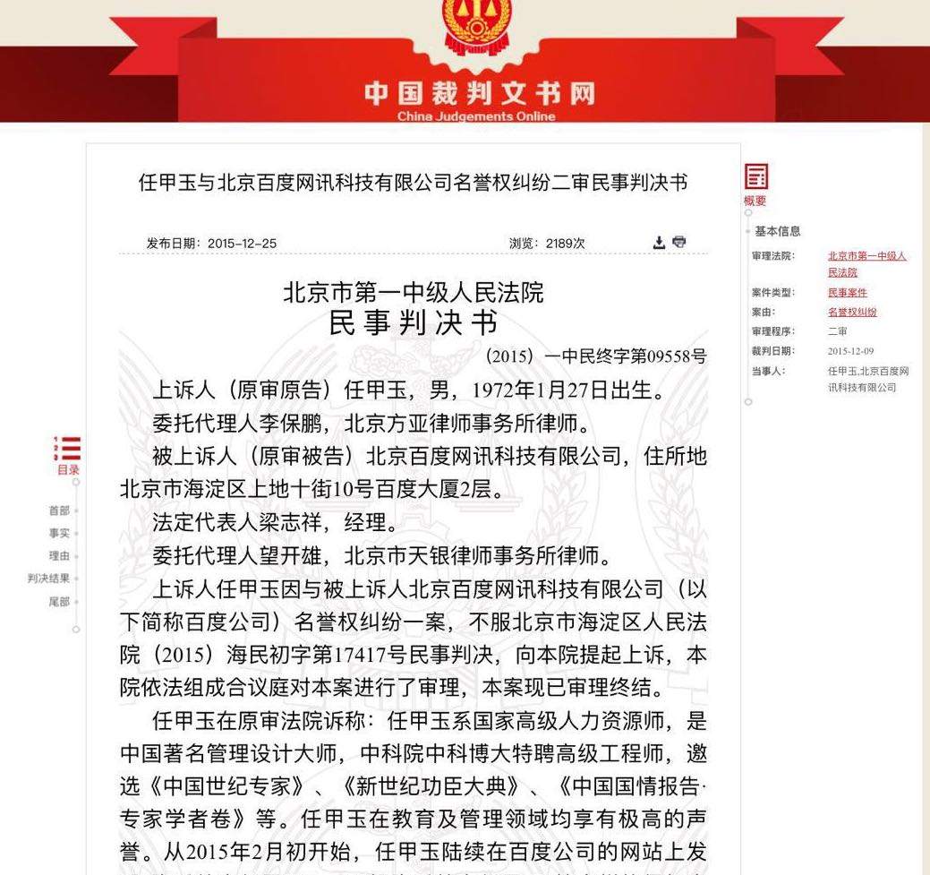 2014年,任某曾在無錫某教育公司工作過一陣子。離職後,任某在百度搜索頁面輸入自己名字後,百度搜索結果顯示有“無錫某教育任某”字樣。只是,同時出現的還有“某教育公司騙局”。在協商無果後,任某將百度損害“被遺忘權”告上了法院。考慮涉訴工作經歷信息與原告目前的個人行業具有直接的相關性及時效性,法院判處任對任某的主張不予支持。