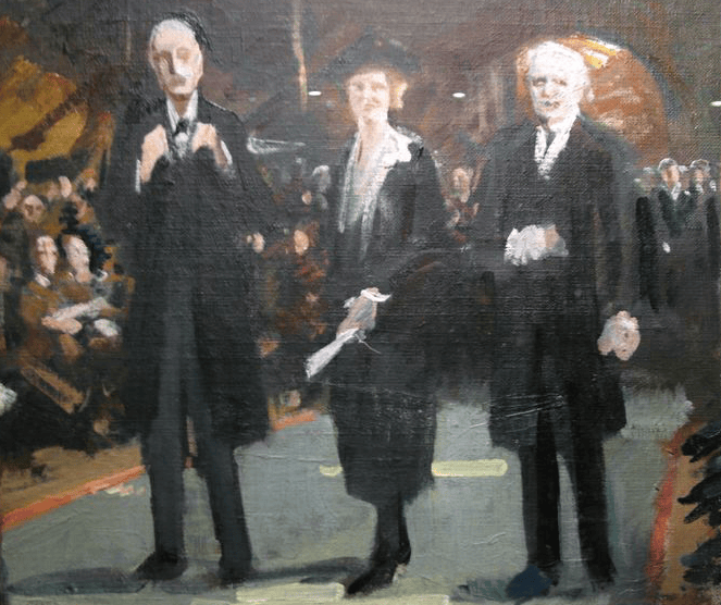 《阿斯特女士隨同阿瑟·詹姆斯·貝爾福和大衞·勞合·喬治步入下議院》如同一幅抓拍攝影作品,忠實再現了1919年12月12日,阿斯特第一次步入英國議會下院的情景。走在她兩邊的,分別是議會兩大主要政黨領袖:左邊的保守黨黨魁貝爾福和右邊的自由黨黨魁勞合·喬治。那一天是阿斯特女士人生的高光時刻,也是她歷時26年的議會生涯的起點。