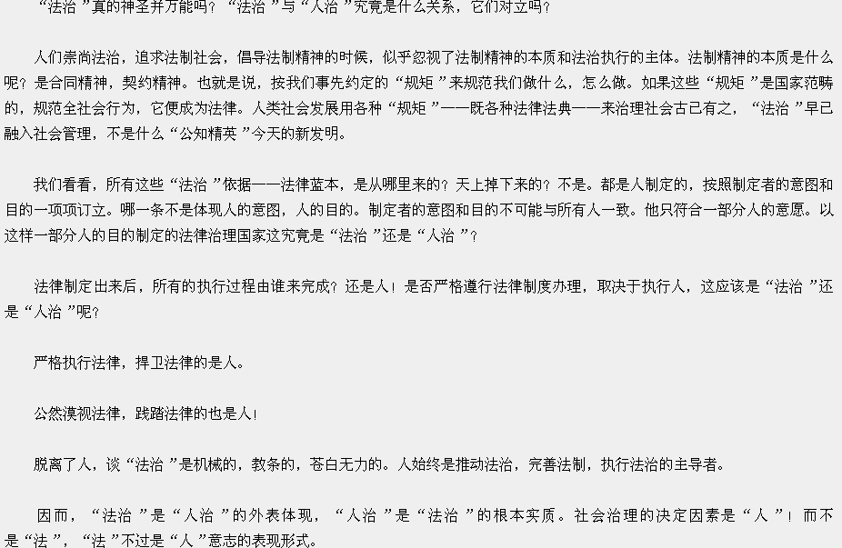 總之,説到底法制制度本身就是人治的一種,單純的制度決定論制度萬能論等這些個思維懶人包可以休矣,若想人人相對而言趨向成聖賢有公心、主人翁精神首先就要把這個推卸每個具體的人責任的思維解放拋棄掉才能開始真正的獨立思考。