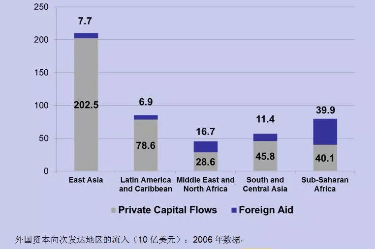 一個簡單的比較可以看出過度的援助對一個地區的負面影響在於擠佔市場動力。這個圖比較不同發展中地區的商業資金和國際援助的佔比。從中可以明顯看出,東亞和拉美地區等國際援助佔比較低的地區正是發展較好地區,而中東、北非、南亞、中亞、撒哈拉非洲等發展緩慢地區則主要依賴國際援助。