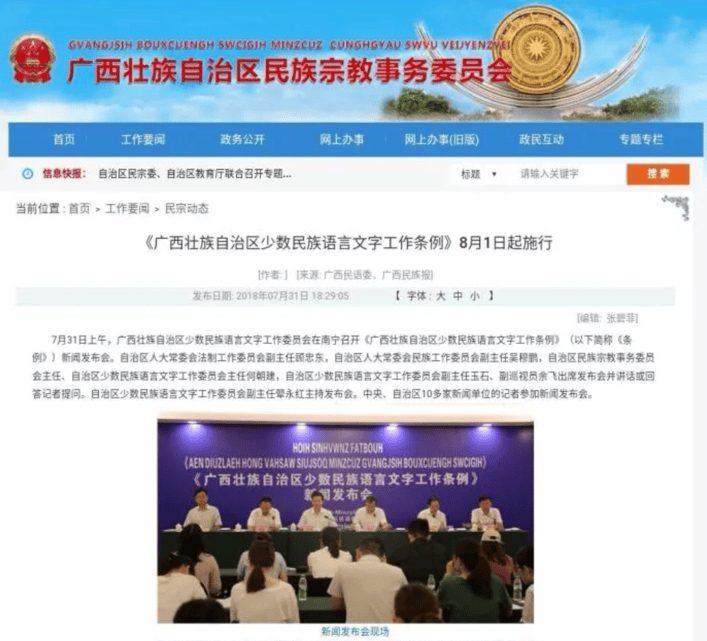 廣西於2018年8月1日起施行《廣西壯族自治區少數民族語言文字工作條例》。《條例》在雙語教育、教師培養、漢壯文字同時使用、人才建設等方面均做出了具體的規定。其中部分內容,要求各級政府應鼓勵和支持幼兒園和中小學校開展漢語言和少數民族語言“雙語教學”;在招錄公務員和事業單位人員時,為熟練掌握雙語的考生提供一些職位[1]。