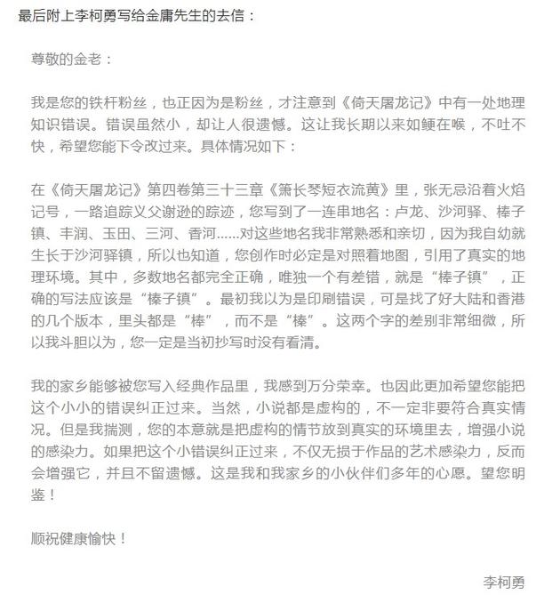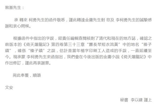 請大師改字的信,從作家六神磊磊又轉交給浙江社科院的博士盧敦基,接着再轉給金庸秘書李以建,終於在9月5日收到秘書回信,“經責任編輯查閲核對了清代和現在的地方誌,確認之前版本的《倚天屠龍記》第四卷第三十三章‘簫長琴短衣流黃’中的地名‘棒子鎮’,確係‘榛子鎮’之誤,估計是當年植字印刷工人造成的手誤,一直延續至今。”回信中也允諾今後出版的小説將會做出修訂。